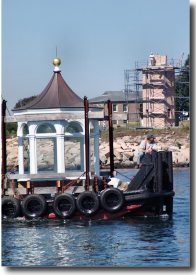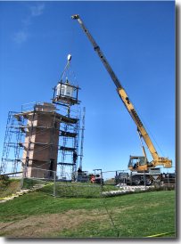 Jones didn’t simply donate and deliver the new lantern to Avery Point Light — he also witnessed the reestablishment of the elegant structure built of mahogany and copper. On September 30th a telescopic crane under the supervision of Joseph Gnazzo Company, Inc., hoisted the lantern high in the air and gently placed it down on its majestic perch atop the 55-foot stone-block tower. Jones commented “It gave me quite a lift coming over the hill, just seeing it…I never grow tired of it.”